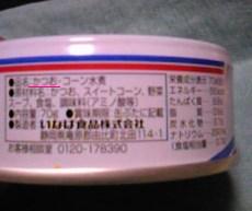 ピンボケで非常に見難いのですが品名のところにかつお・コーン水煮って書いてあります。