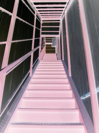 ここの階段は屋根部分が半透明の波板なので冬は暖かく夏はサウナのように暑いです。