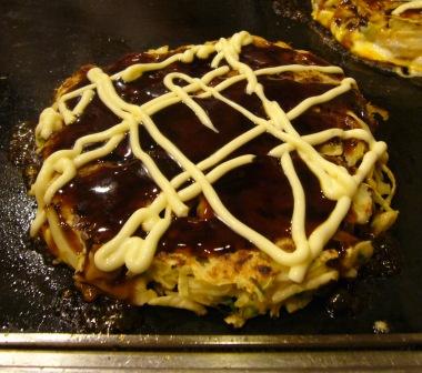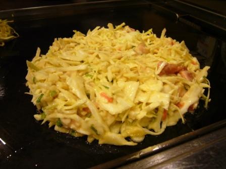混ぜて混ぜて…鉄板の上にまあるく流して暫く待ちます。